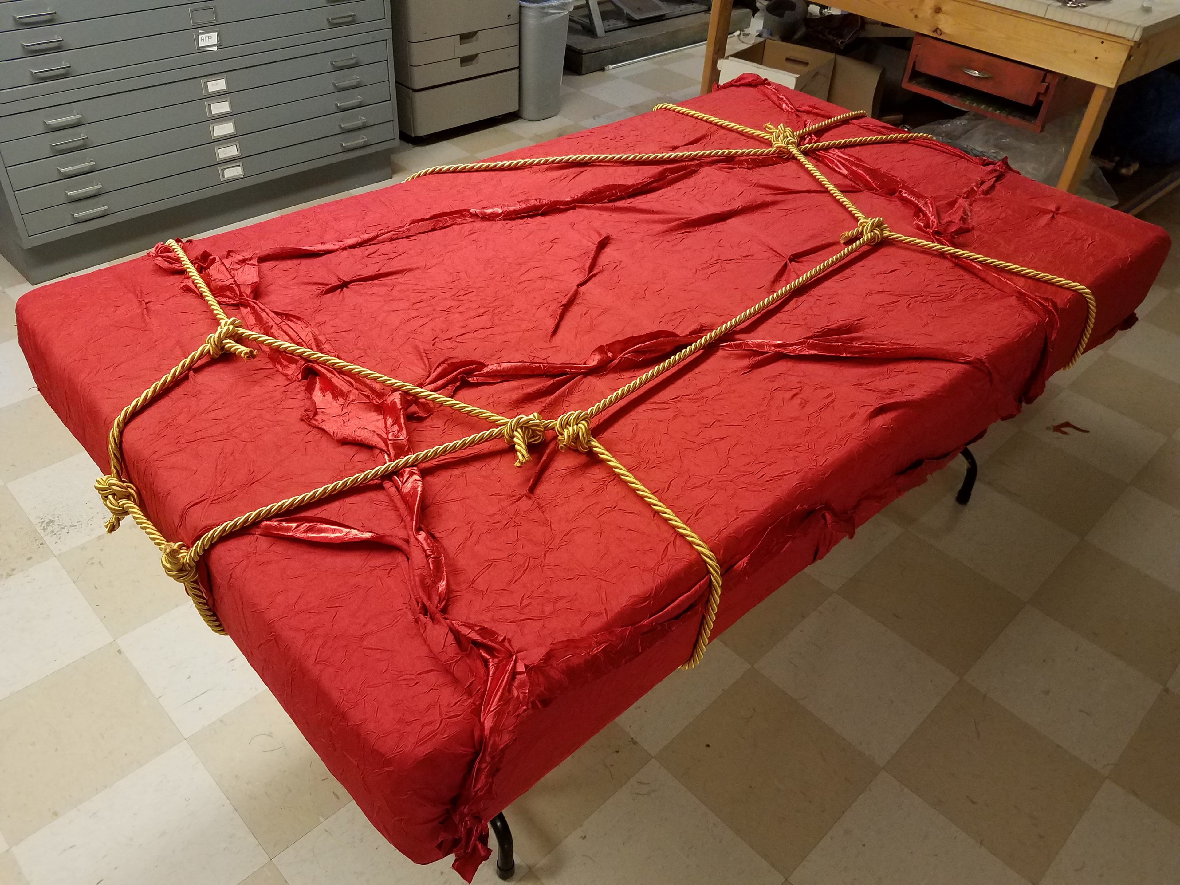 On the left is a litter custom built with a foam interior to keep it light, and on the right is a raft built for "Metamorphoses" to float on the water and hold two actors.